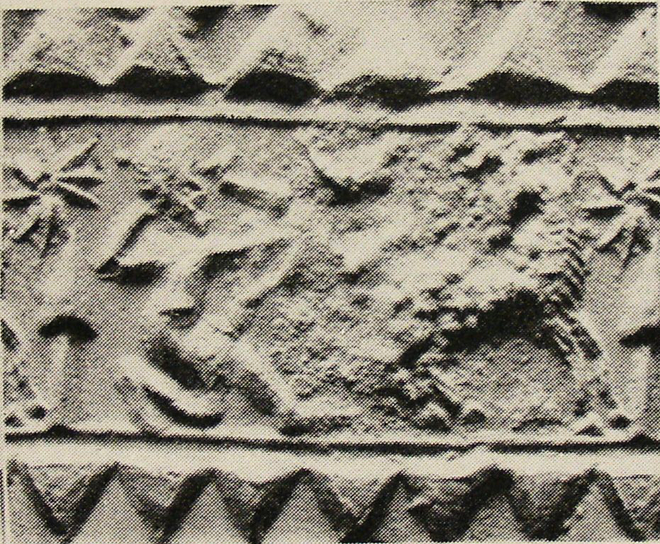 | Description of the seal image | The scene is framed by line borders with triangles pointing outwards at the top and bottom. A half-kneeling hunter (archer) wearing a broad-belted tunic aims his bow at a bull. Between the two figures is a crescent moon, while behind the archer is a nine-rayed star above the spade of Marduk (marru). |