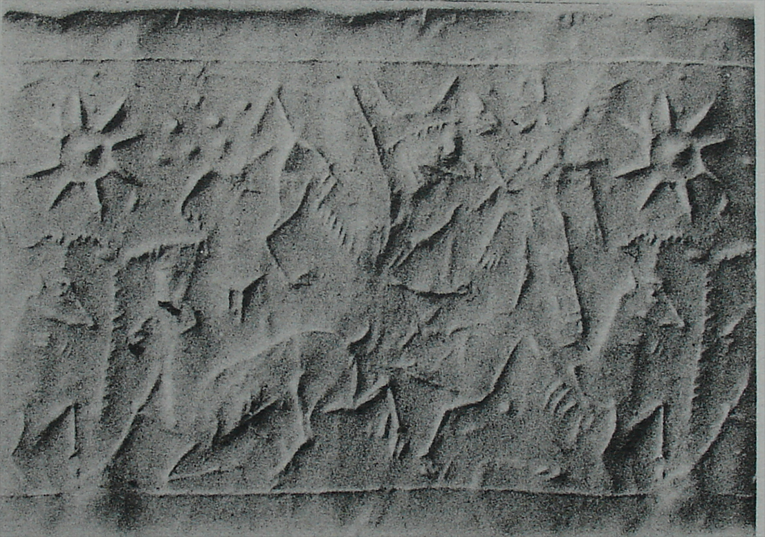 | Description of the seal image | The scene is framed by line borders at the top and bottom. A four-winged hero grasps a half-kneeling griffin while two half-kneeling mouflons facing each other. Between the latter is an ear of wheat ('bottle-brush' tree). A crescent moon appears above the griffin, and there is a double wedge above the left-facing mouflon. An eight-rayed, globe-centred star and the Sibitti (Pleiades) are behind the winged hero and the griffin. |