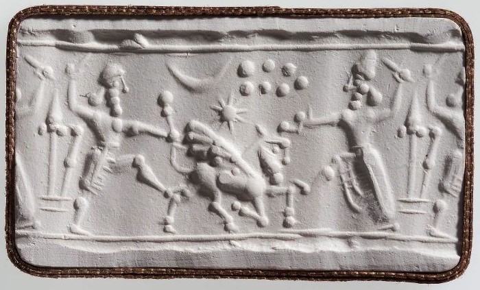 | Description of the seal image | The scene is framed by line borders at the top and bottom. Enkidu and Gilgamesh grasp the Bull of Heaven with one hand and brandish weapons with the other while stepping on the hybrid creature's legs. Enkidu wears a belted, fringed kilt, whereas Gilgamesh wears a conical headdress and a long, broad-belted, fringed, open robe. Behind them are the tasselled spade of Marduk (marru) and the stylus of Nabu on the same stand. Above the Bull of Heaven are a crescent moon, the Sibitti (Pleiades) and a nine-rayed, globe-centred star. |