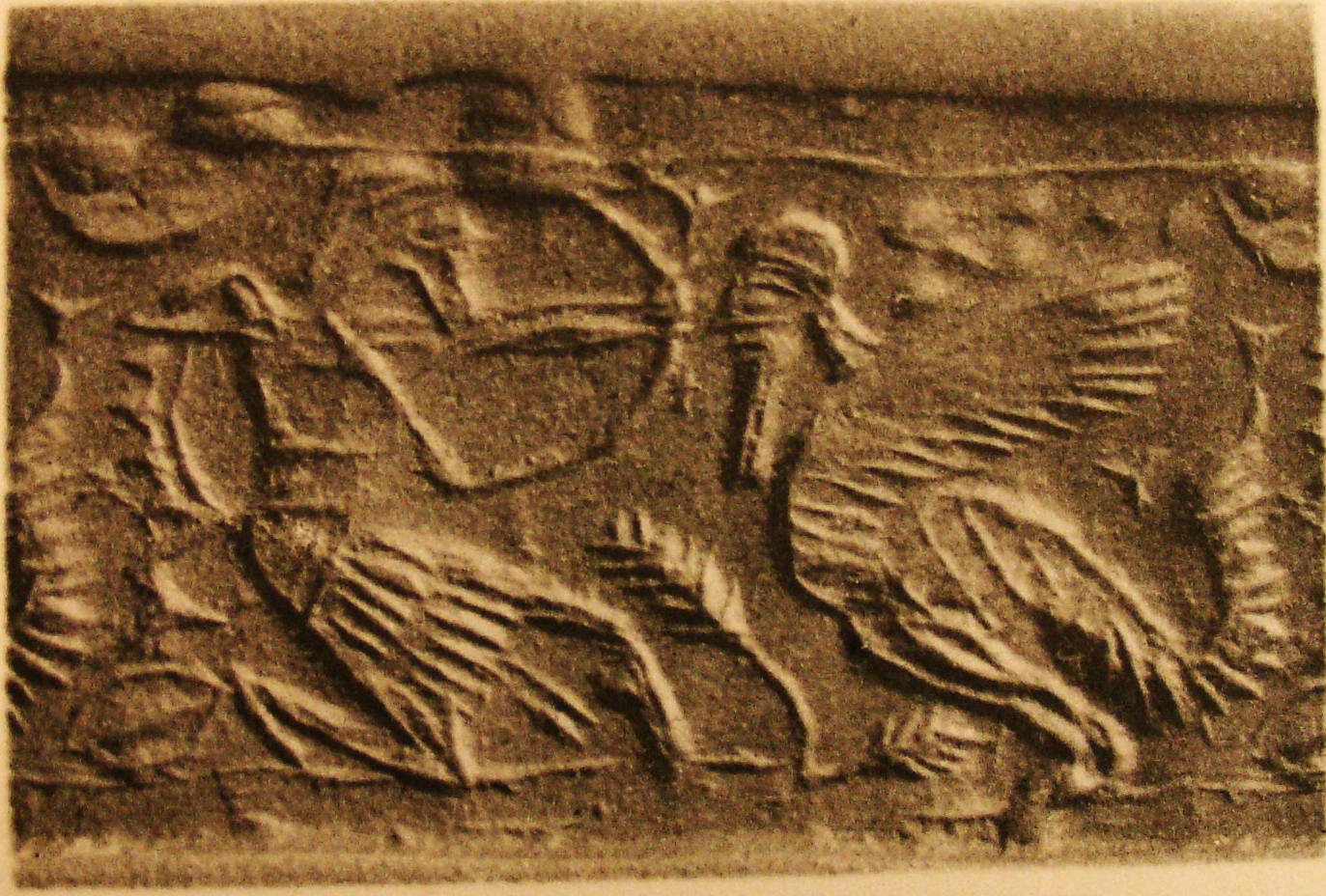 | Description of the seal image | The scene is framed by line borders at the top and bottom. A half-kneeling, bearded hero (archer) wearing a broad-belted tunic with a fringed edge aims his bow at a bearded scorpion-tailed bird-man. He has a spiked shield on his back. Between the figures are two ears of wheat ('bottle-brush' trees) on the ground and a wedge above them. Behind them is a crescent moon in the sky, and a rhomb and a wedge below. Two further wedges appear next to the hybrid creature's tail. |