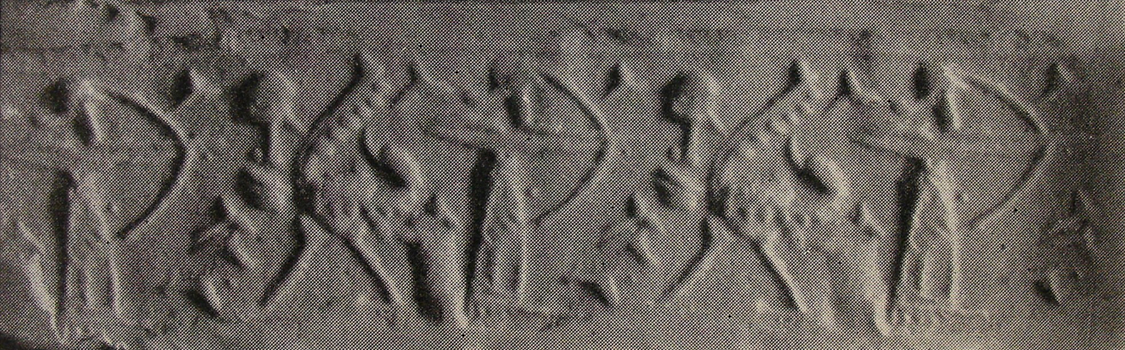 | Description of the seal image | The scene is framed by line borders at the top and bottom. A bearded hero (archer) wearing a long, broad-belted robe with a fringed lower edge aims his bow at a scorpion-tailed bird-man. Between and behind them are six wedges in total. |