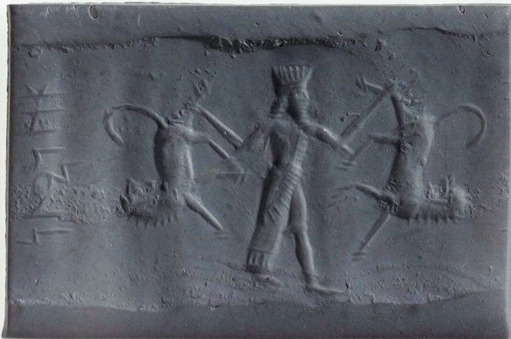 | Description of the seal image | A bearded hero grasps a lion on either side, each by a hind leg. He wears a dentate or feather crown and a long, fringed, open robe over a short tunic. Behind the lions is an alphabetic inscription. |