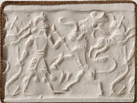 | Description of the seal image | A bearded hero grasps the foreleg of a rampant bull with one hand and holds a sickle sword (scimitar) in the other. He wears a double-belted, fringed and tasselled tunic. In front of the hero is another, jumping bull with a crescent moon above. Between the hind legs of the bull and the legs of the hero are two wedges. |