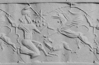| Description of the seal image | A half-kneeling, bearded hero grasps the foreleg of a rampant griffin with one hand and brandishes a sword with the other. He wears a round headdress and a long, broad-belted, fringed, open robe. A sickle sword (scimitar) hangs from his elbow, and there is another sword with a scabbard at his waist. Between the two figures is a small, reclining quadruped below and an eight-rayed, globe-centred star above the Sibitti (Pleiades) in the sky. A crescent moon appears above the griffin's wing. |