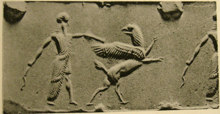 - griffin: rampant, head turned backwards, winged - hero: bearded, wearing a long, tiered and fringed, open robe over a short tunic, holding a sickle sword (scimitar) |