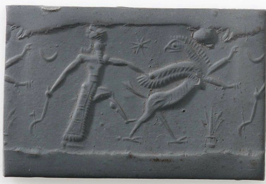 | Description of the seal image | A bearded hero grasps the wing of a rampant griffin with one hand and holds a sickle sword (scimitar) in the other while trampling on the hind legs of the hybrid creature. He wears a long, broad-belted, fringed, open robe over a short tunic. Above each of his arms is a crescent moon and an eight-rayed, globe-centred star, respectively. Below the griffin's forepaws is a small, cactus-like plant in a pot. |