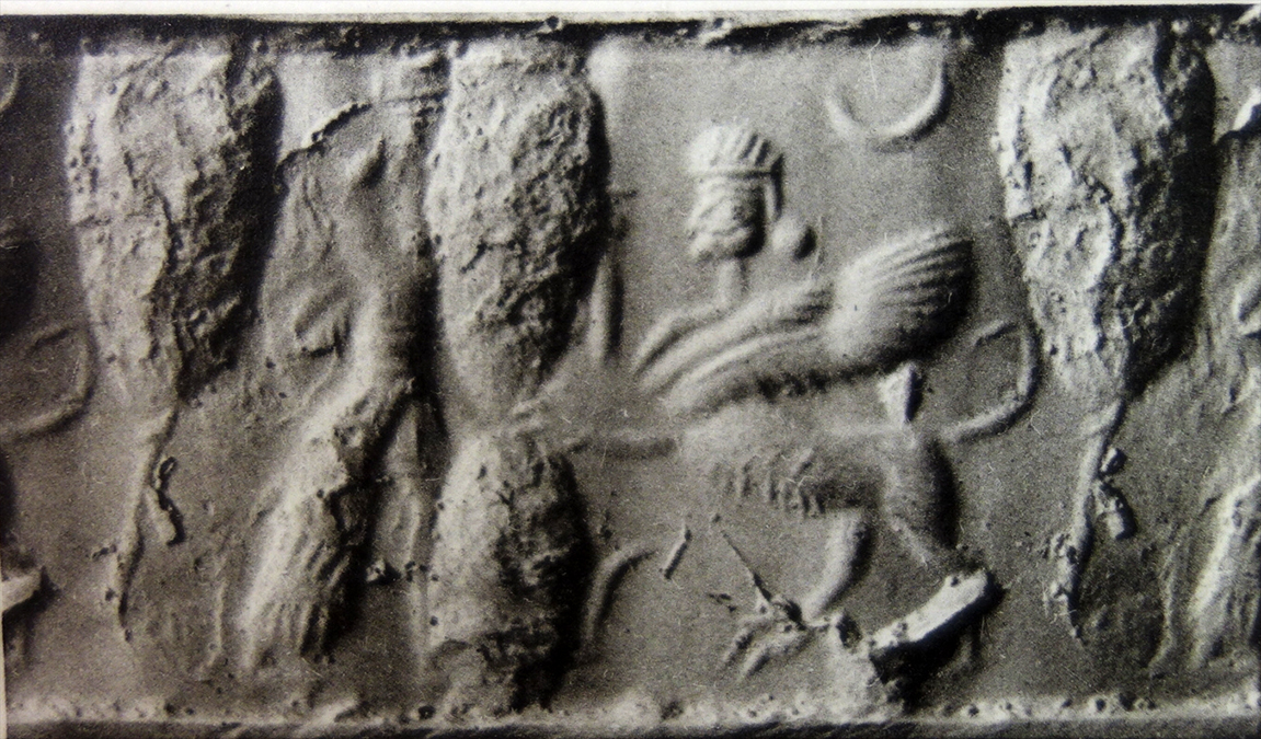 - crescent moon - hero or winged hero: bearded, possibly winged, wearing a long, broad-belted, tiered and fringed open robe over a short tunic, holding a sickle sword (scimitar) - human-headed winged lion (shedu, sphinx): rampant, beardless - stylised plant: small, cactus-like |