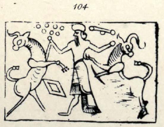 - 'ball-and-staff' - bulls (2): rampant, heads turned backwards - hero: bearded, wearing a horned, round headdress and a long, belted, tiered and fringed open robe over a short tunic - rhomb - Sibitti (Pleiades) |