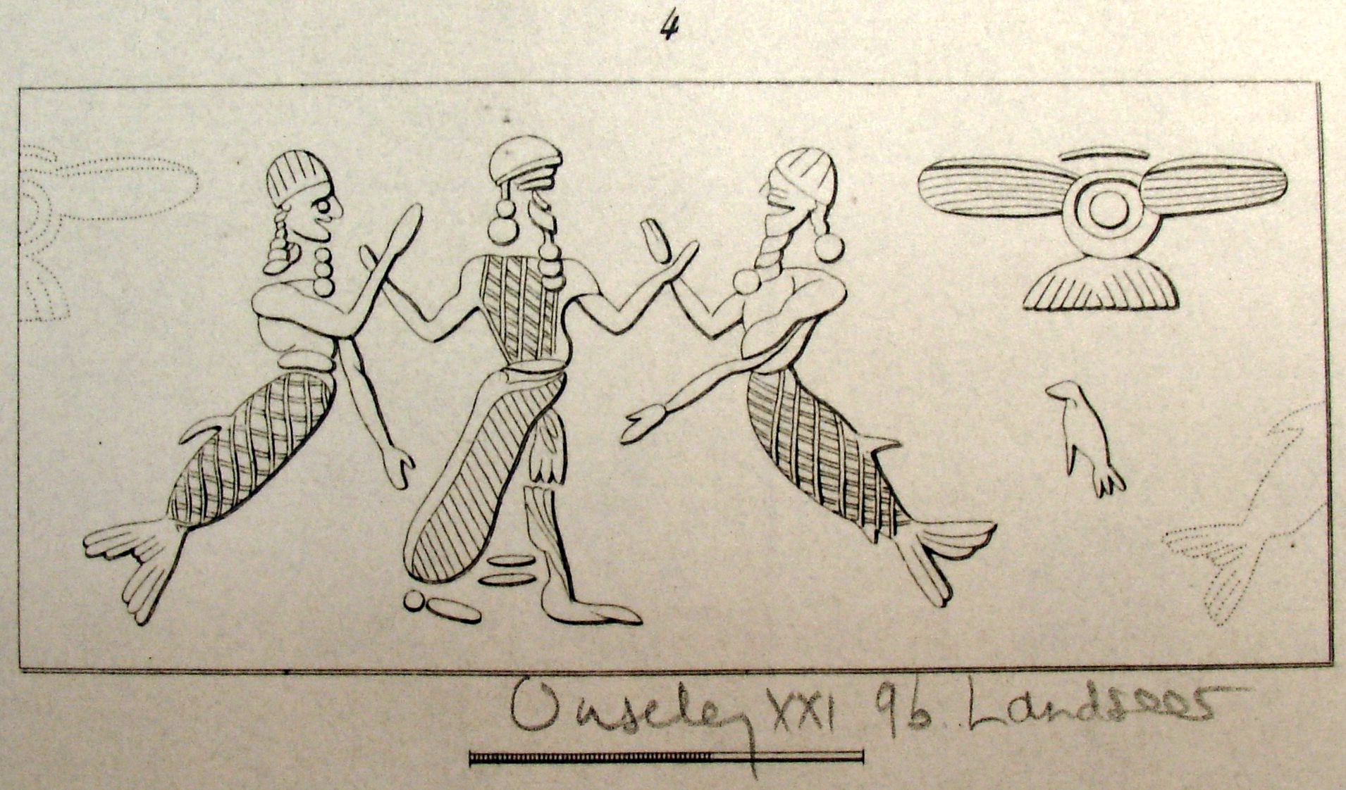 - bird or fish - fish-men (kulullus) (2): bearded - hero: bearded, wearing a brimmed headdress and a long, belted, fringed, open robe over a short tunic; the upper part of his garment is decorated with a net or crosshatch pattern - winged sun-disc |