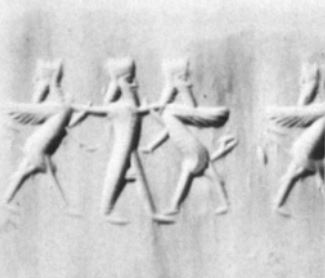 - hero: bearded, wearing a dentate crown (cidaris) and a long, fringed, open robe over a short tunic - human-headed winged lions (lamassus, sphinxes) (2): rampant, heads turned backwards, wearing dentate crowns (cidarises) |
