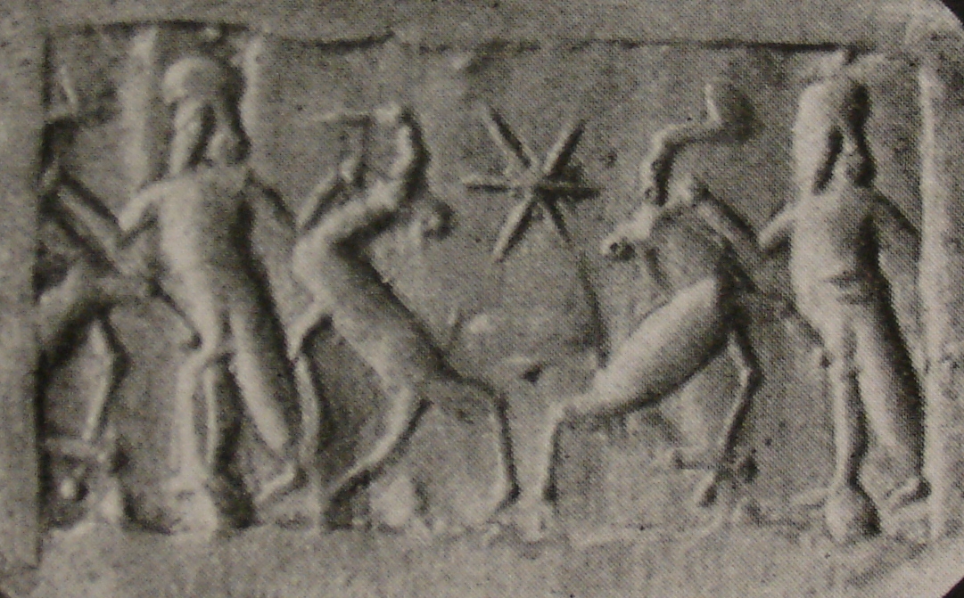 | Description of the seal image | A bearded hero grasps a rampant wild goat (ibex) on either side, each by the ear. He wears a round headdress and a long, open robe. A six-rayed, globe-centred star appears in the sky behind the animals. Below the wild goat on the left is a ball-and-staff symbol. |