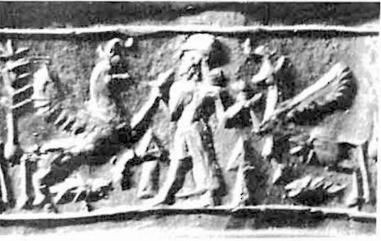 | Description of the seal image | The scene is framed by line borders at the top and bottom. A bearded hero grasps a rampant winged bull on either side, each by a foreleg. He wears a long, open robe over a short tunic. Between the hybrid creatures' legs are a fish and the spade of Marduk (marru) on either side. A stylised plant with a round base appears behind the winged bulls. |