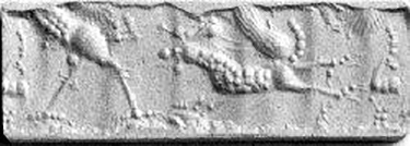 | Description of the seal image | The upper half of the object has been broken off. The remaining scene depicts Ninurta (archer), likely aiming his bow at the rampant Anzu (lion-griffin) while standing on the back of the charging Abubu (lion-dragon). Behind the latter is a small wild goat (ibex) with bunched legs on four small globes. |