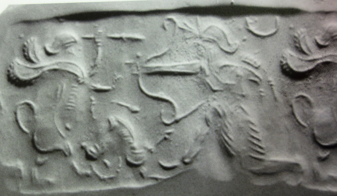 | Description of the seal image | A half-kneeling, bearded hero (archer), wearing Persian clothing (court robe), aims his bow at a rampant human-headed winged lion (shedu, sphinx), seemingly throwing a spear at him. The archer has a tasselled quiver on his back. Between the two figures is an inverted wild goat (ibex), while behind them is a crescent moon in the sky. It is possible that the spear actually represents an arrow that pierces through the hybrid creature's raised forepaw. |