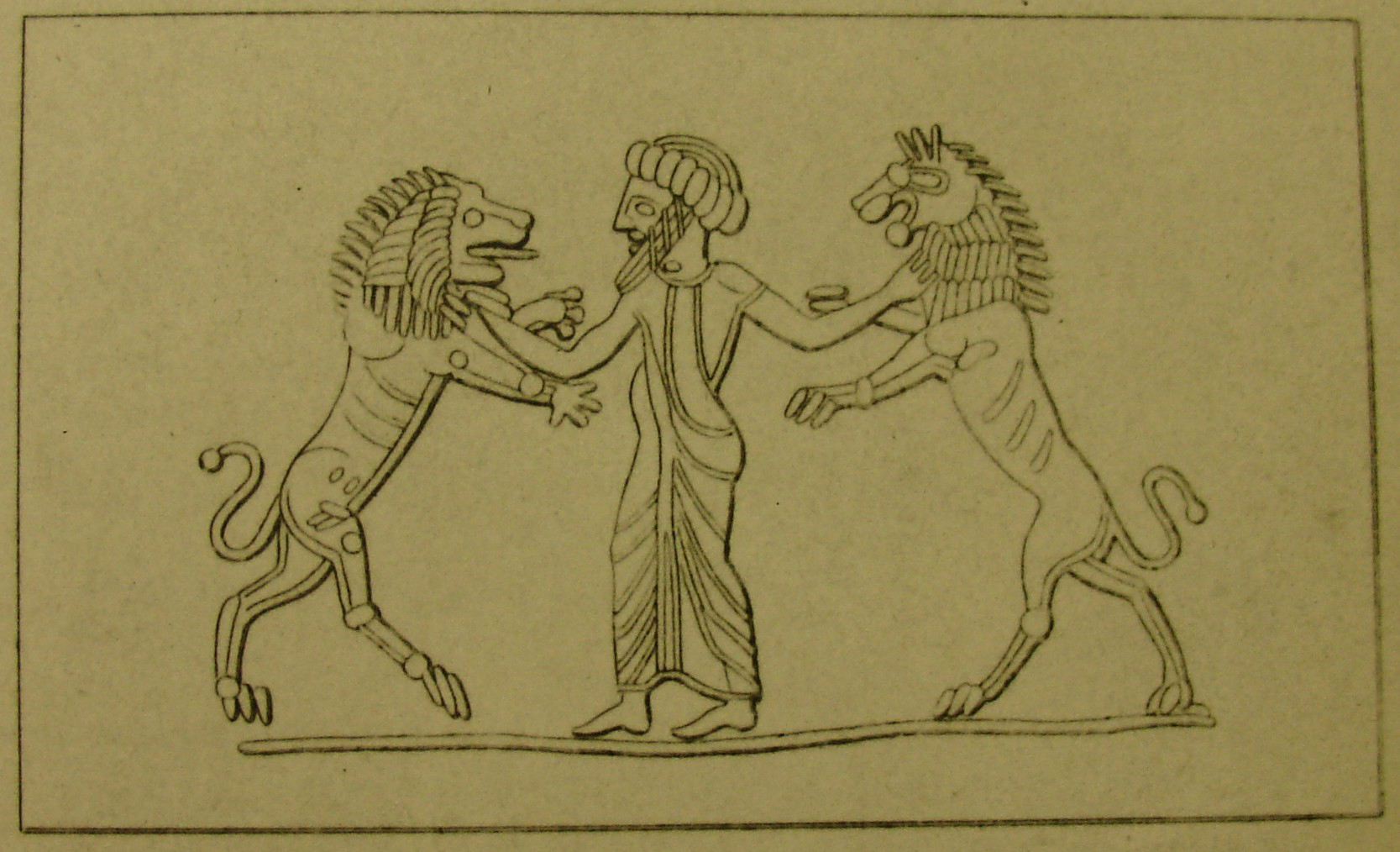 | Description of the seal image | A Persian hero grasps a rampant lion on either side, each by the throat. He wears a brimmed headdress and Persian clothing (court robe). All figures are set on a groundline. |