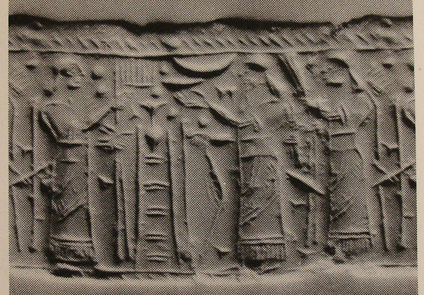 | Description of the seal image | The scene is framed by chevron borders running in opposite directions at the top and bottom. A king or dignitary stands between two beardless attendants. Both attendants wear long, broad-belted, fringed robes, have towels thrown over their shoulders, and hold fans and pieces of cloth. The king wears similar clothing, has a sword at his waist and a tassel hanging from his hair, and holds a cup and a bow. All three figures wear swords at their waists. Behind the king, the attendant has a quiver full of arrows over his shoulder. The attendant Between the king and the attendant facing him is a vessel on a stand (pot-stand). A crescent moon appears above the cup. Seven globes, representing the Sibitt (Pleiades), as well as six single and one double wedge, appear scattered around the image field. |
