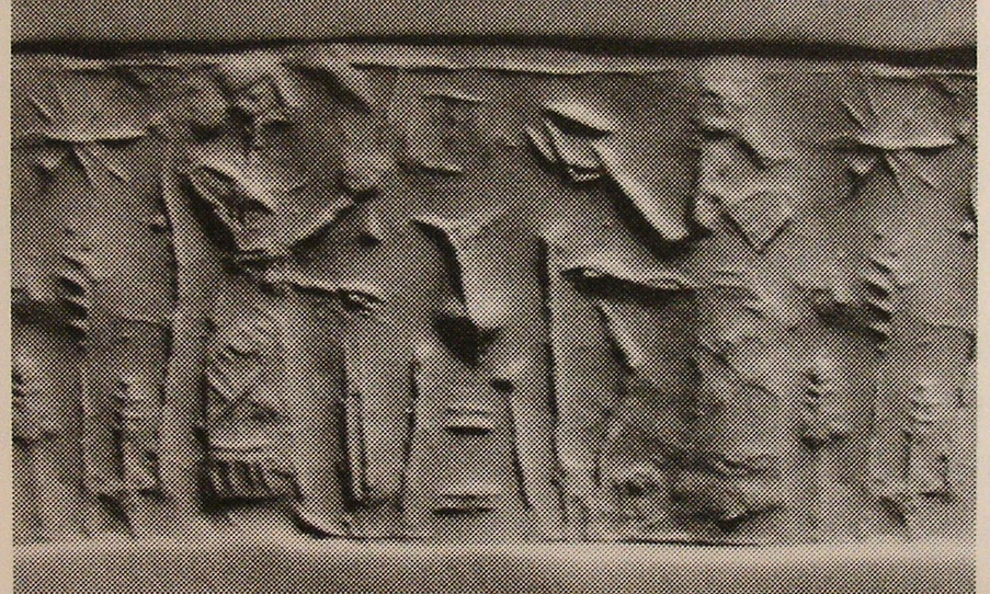 | Description of the seal image | The scene is framed by line borders at the top and bottom. A beardless attendant faces a bearded king or dignitary. The attendant wears a long fringed robe, has a towel thrown over his shoulder, and holds a flag-shaped fan and a cloth. The king wears similar clothing and holds a cup and a bow. Between the two figures is a vessel on a stand (pot-stand), while behind them are three ears of wheat ('bottle-brush' trees) below an eight-rayed star. |