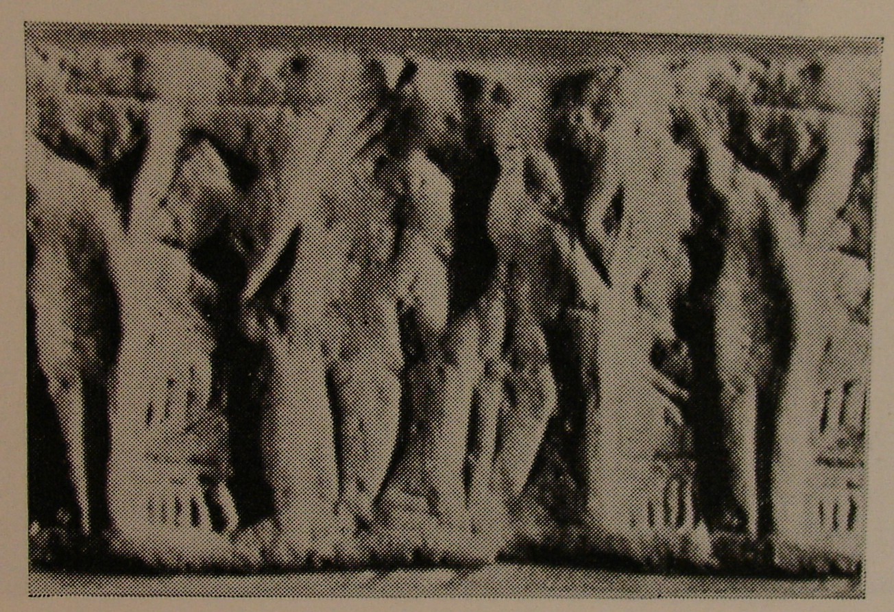 | Description of the seal image | The scene is framed by line borders at the top and bottom. A beardless attendant faces a bearded king or dignitary. The attendant wears a long fringed robe and holds a fan and a cloth. The king wears similar clothing and holds a cup and a bow. Between the two figures is a vessel on a stand (pot-stand), while behind them is an ear of wheat ('bottle-brush' tree) below a crescent moon. |