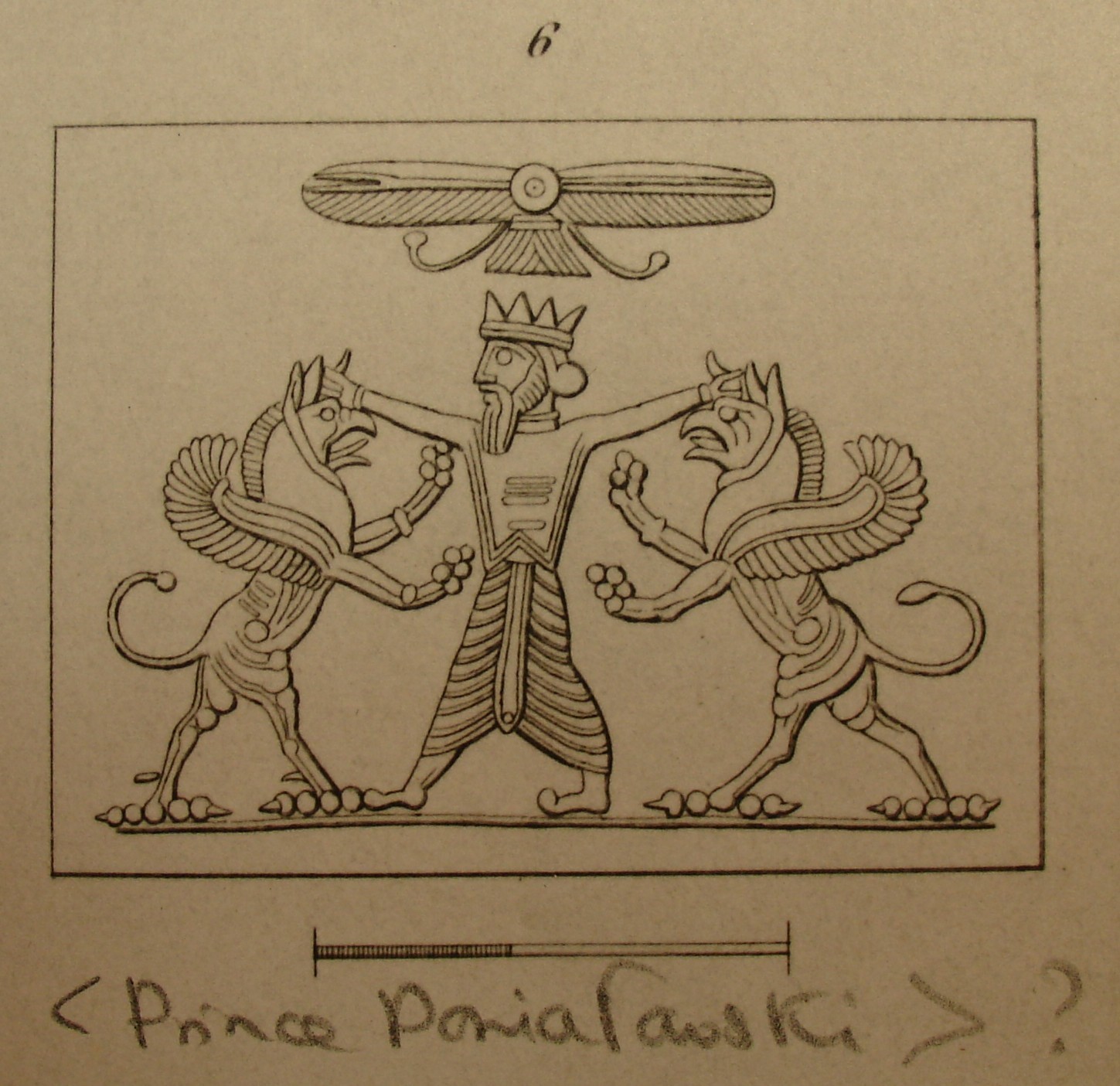 | Description of the seal image | The royal hero grasps a rampant lion-dragon on either side, each by the horn. He wears a dentate crown (cidaris) and Persian clothing (court robe). The figures are set on a groundline and above them is the winged sun-disc. |