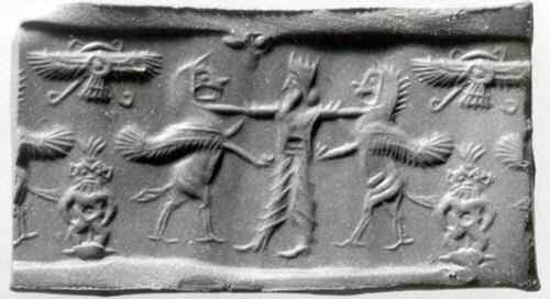 | Description of the seal image | The royal hero grasps a rampant lion-griffin on either side, each by the throat. He wears a dentate crown (cidaris) and Persian clothing (court robe). Behind the hybrid creatures is the winged sun-disc above a small Bes figure depicted in frontal view. He wears a feather crown and a loincloth. |