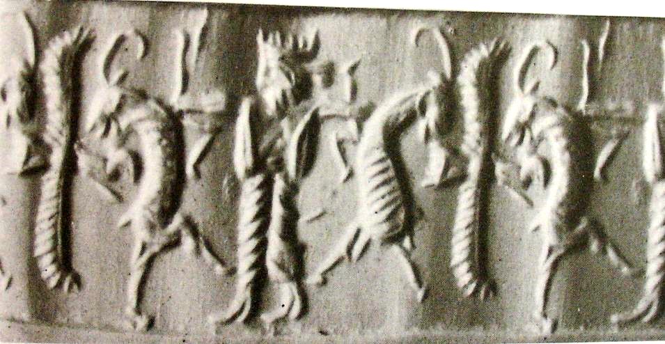 | Description of the seal image | The royal hero grasps a rampant wild goat (ibex) on either side, each by the throat. He wears a dentate crown (cidaris) and Persian clothing (court robe). Behind the wild goats is a vertically-set Ahura Mazda emerging from the winged sun-disc . |