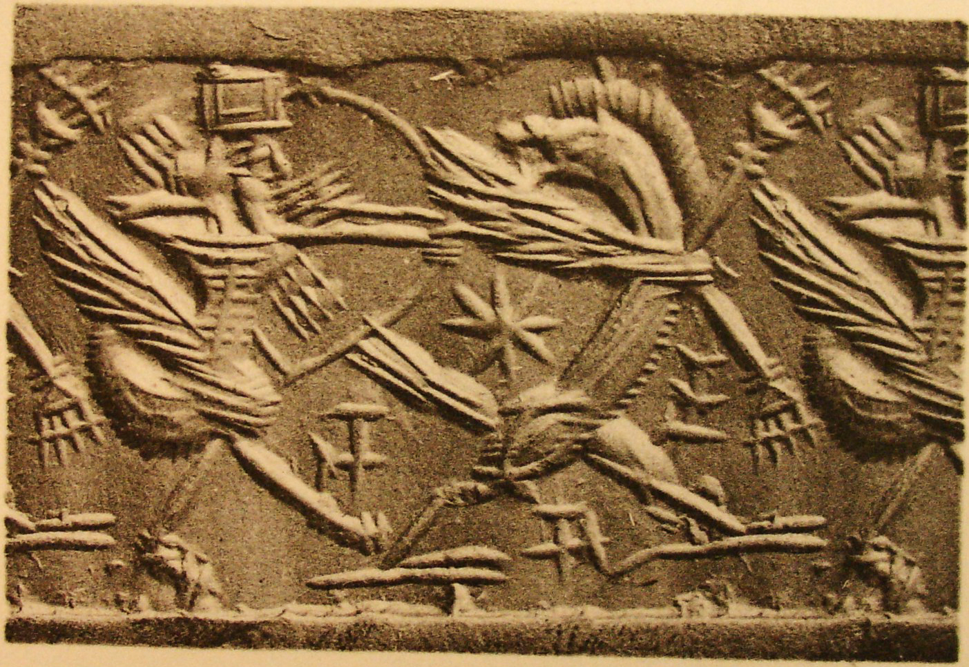| Description of the seal image | A bearded scorpion-tailed bird-man (archer) wearing a rectangular headdress aims his bow at a rampant lion-griffin (Anzu). The archer has two quivers full of arrows on his back. Between them is a MAŠ sign and the mirrored version of the same appears between the legs of the lion-griffin. A DINGIR sign is below the lowered forepaw of the hybrid creature. An eight-rayed star appears below its wing. The scene is likely a different representation of the fight between Ninurta and Anzu. |