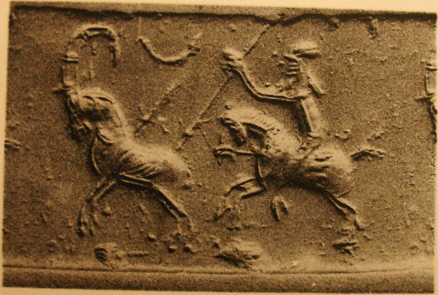 | Description of the seal image | A horse-riding hunter (spearman) wearing a Median garment and headdress (bashlyk) aims his barbed spear at a fleeing wild goat (ibex). The latter already has a similar but shorter spear in its back. Above the animal is a crescent moon. |