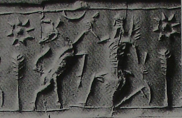 | Description of the seal image | The scene is framed by line borders at the top and bottom. A half-kneeling winged hero grasps the foreleg of a rampant bull with one hand and holds a sickle sword (scimitar) in the other. He wears a triple-belted, fringed tunic and has a sword at his waist. Above the bull is a crescent moon, while behind it is an eight-rayed, globe-centred star above an ear of wheat ('bottle-brush' tree). |