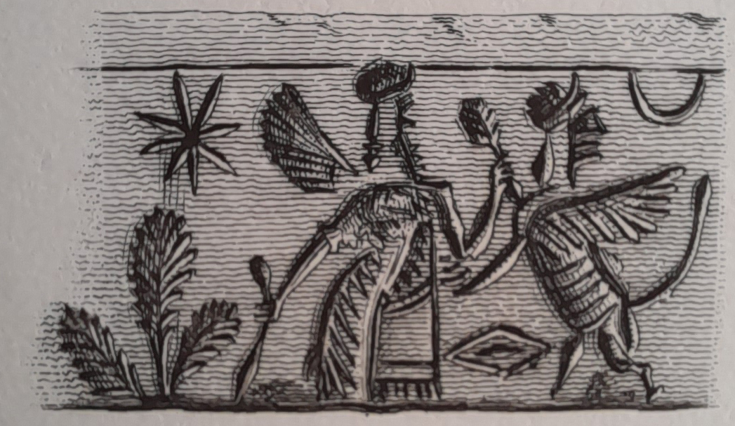 - ears of wheat ('bottle-brush' trees) (3) - crescent moon - human-headed winged lion (shedu, sphinx): rampant, head turned backwards, beardless, wearing a horned tiara - rhomb - star: eight-rayed - winged hero: winged, bearded, wearing a horned tiara and a long, fringed robe, holding a sickle sword (scimitar) |