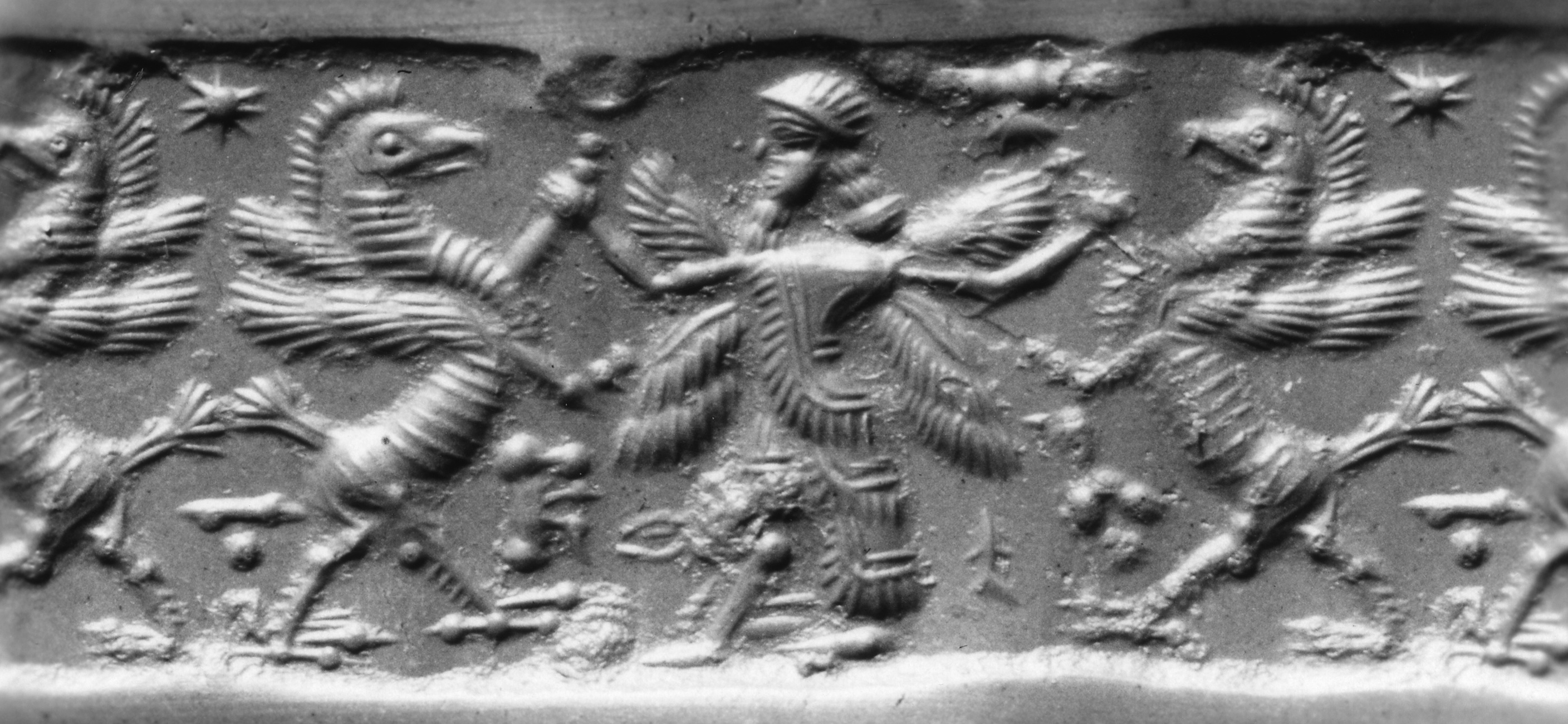 Niederreiter 2024, 233–234 fig. 144. Niederreiter Zoltán 2024. “‘When you blow, the world regions tremble’: Pazuzu, the Newcomer to the Mesopotamian Demon World.” In: Niederreiter Zoltán et al. (eds.) Mesopotamia: Kingdom of Gods and Demons. Budapest: Museum of Fine Arts, Budapest, 326–335. WAM: https://art.thewalters.org/detail/16620/cylinder-seal-with-winged-deity-with-mythical-bird/ [accessed: 11-11-2023]. |