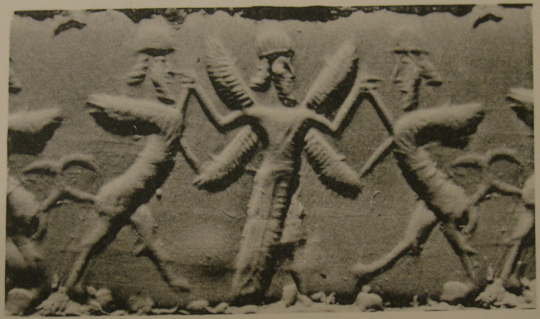 - human-headed winged lions (shedus, sphinxes) (2): rampant, bearded, seemingly wearing round headdresses - winged hero: bearded, four-winged, wearing a long, broad-belted, fringed, open robe over a short tunic |