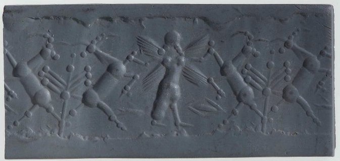 | Description of the seal image | A bearded winged hero grasps a rampant wild goat (ibex) on either side, each by a foreleg. He wears a long, open robe over a short tunic. On either side of his legs are a fish and a rhomb, respectively. Behind the animals is a stylised tree with globe-tipped branches. |