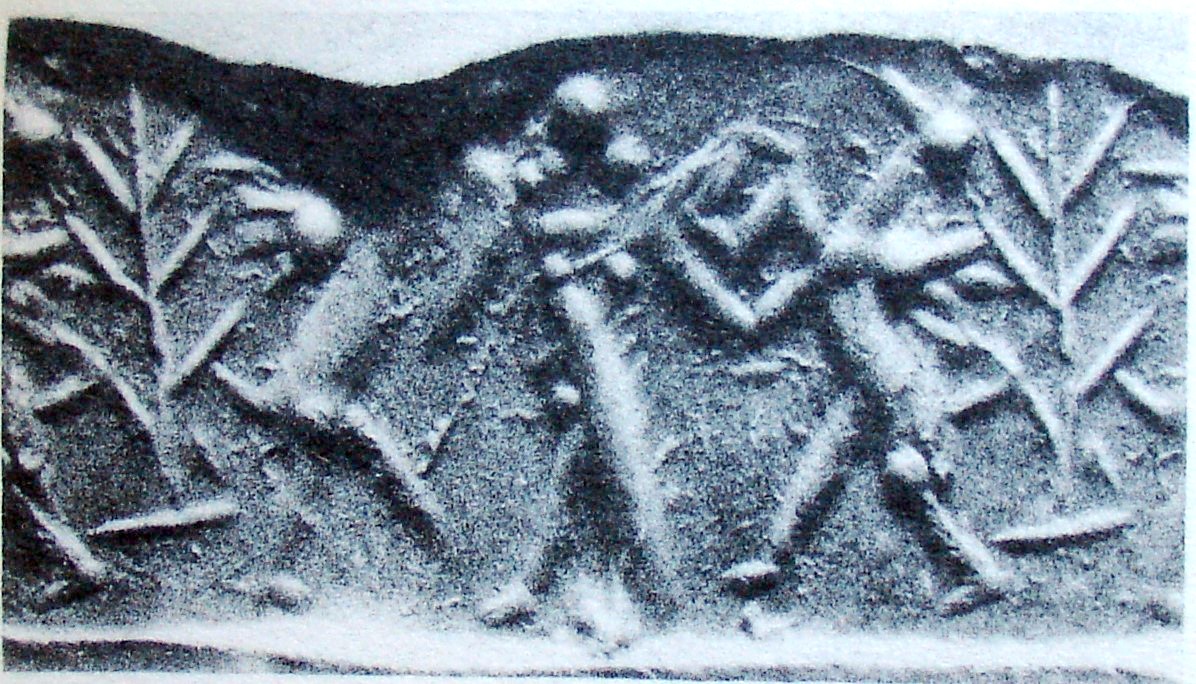 | Description of the seal image | A bearded winged hero grasps a winged wild goat (ibex) on either side, each by a foreleg. He wears a long, open robe. Behind the rampant beasts is a stylised tree on a stand. |