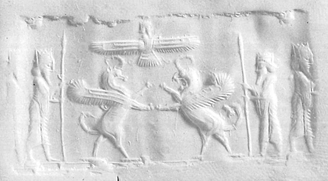 | Description of the seal image | Ahura Mazda emerges from the winged sun-disc above two rampant lion-dragons fighting each other. Behind the beasts stands a royal hero on either side, holding a spear. The lower four figures are set on a groundline. |