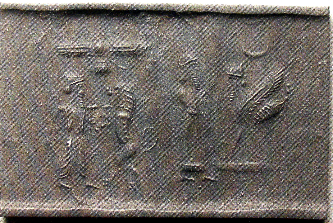 | Description of the seal image | The seal image comprises two scenes. In the contest scene, the royal hero grasps the throat of a rampant lion with one hand and holds a dagger in the other. He wears a dentate crown (cidaris) and Persian clothing (court robe). Above them is the winged sun-disc. The cultic scene depicts a bearded worshipper facing a scorpion-tailed bird-man. He wears a round headdress and a long, belted robe with a fringed lower edge and raises both hands. The hybrid creature wears a conical headdress and stands on a platform. Above its wings is a crescent moon. |