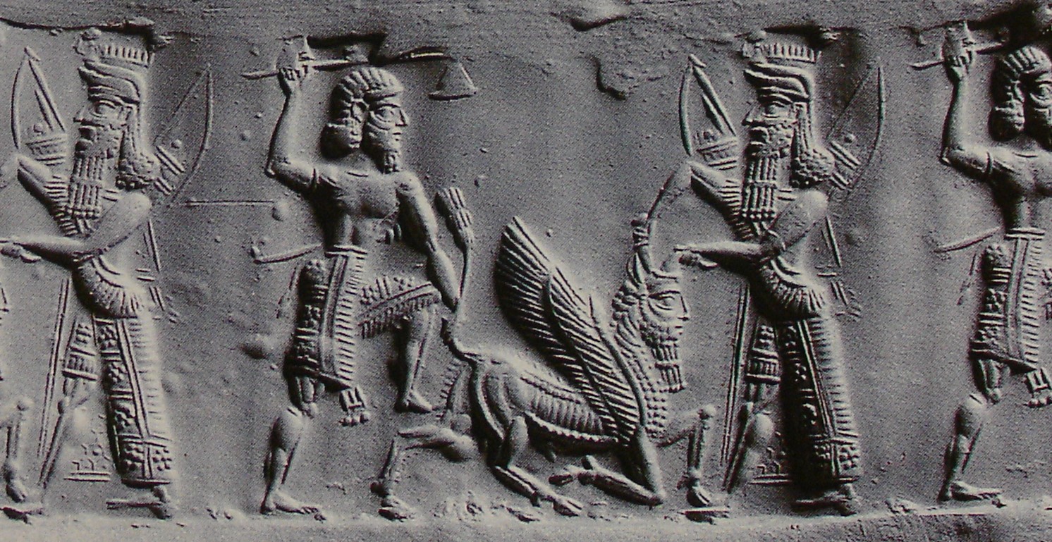 | Description of the seal image | Enkidu and Gilgamesh kill the stumbling Bull of Heaven. Enkidu grasps the tail of the beast with one hand and brandishes an axe with the other while stepping onto the creature's hind leg. He wears a double-belted, fringed and tasselled kilt and has a sword at his waist. Gilgamesh grasps the horn of the hybrid creature with one hand and stabs it in the head with a dagger. He wears a feather-topped, horned headdress and a long, fringed, open robe over a short tunic. He has two bows in tasselled bow cases on his back. Their robes are decorated with a rosette-in-square pattern and Gilgamesh's robe is decorated with a hexagonal pattern with dots inside between his legs. |