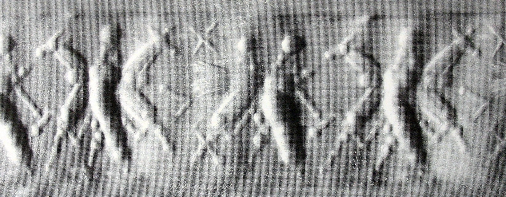 - hero 1: bearded, a round headdress and a long, open robe over a short tunic - human-headed winged bull (aladlammu): rampant, bearded - hero 2: bearded, wearing a round headdress and a long, open robe over a short tunic, holding a weapon - quadrupeds (2): likely bulls, rampant, heads turned backwards - star: six-rayed |