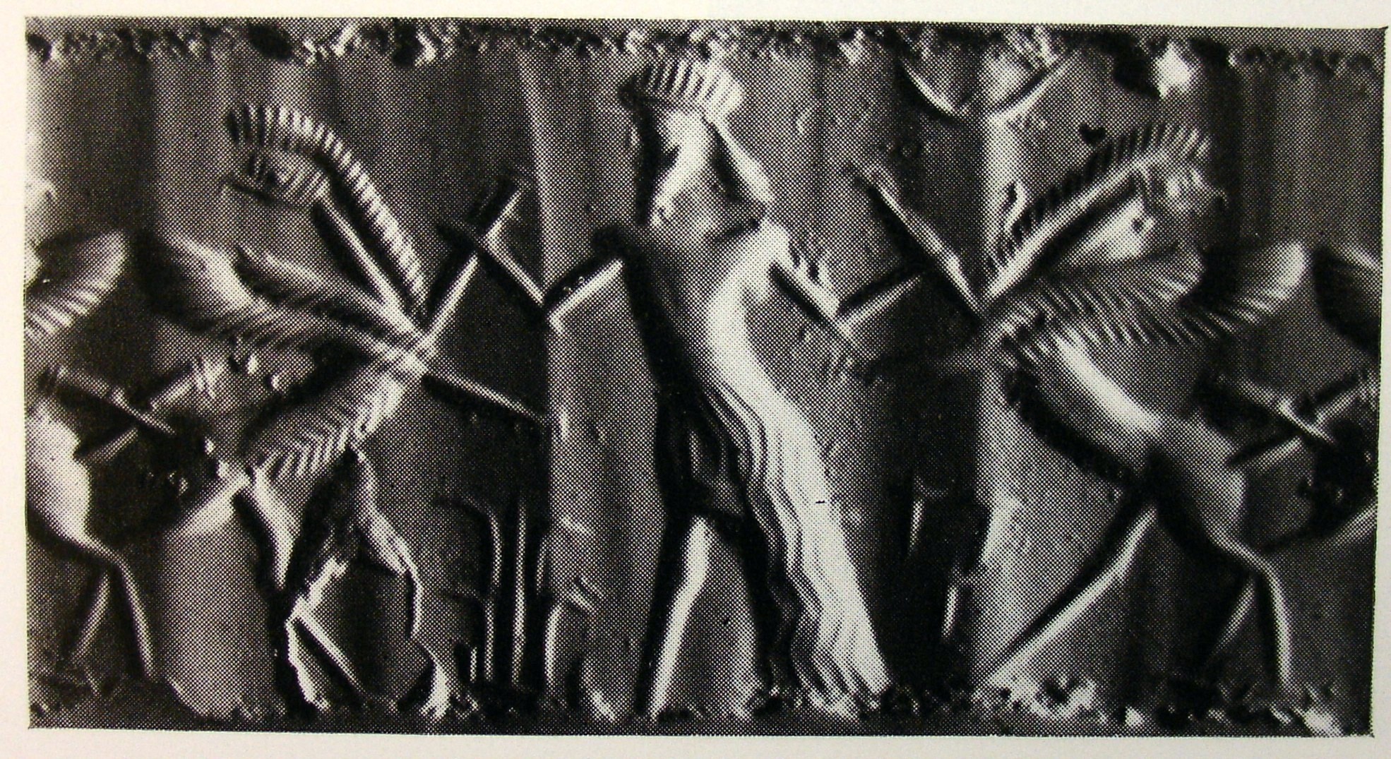 | Description of the seal image | A bearded hero grasps a rampant griffin on either side, each by a foreleg. He wears a long, broad-belted, fringed, open robe over a short tunic. On either side of his legs are a stylised plant and a cuneiform sign. Above the beast on the right is a crescent moon. |