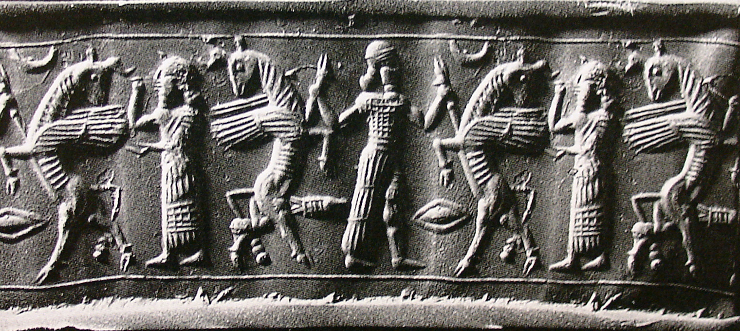 - borderlines (2): line borders at the top and bottom - crescent moon - fish - hero: bearded, wearing a brimmed headdress and a long, double-belted, tiered and fringed robe over a short tunic, the upper part of his garment is decorated with a net or crosshatch pattern - rhomb - winged bulls (2): rampant, heads turned backwards - worshipper: bearded, wearing a long, fringed robe, the lower part of which is decorated with a net or crosshatch pattern |