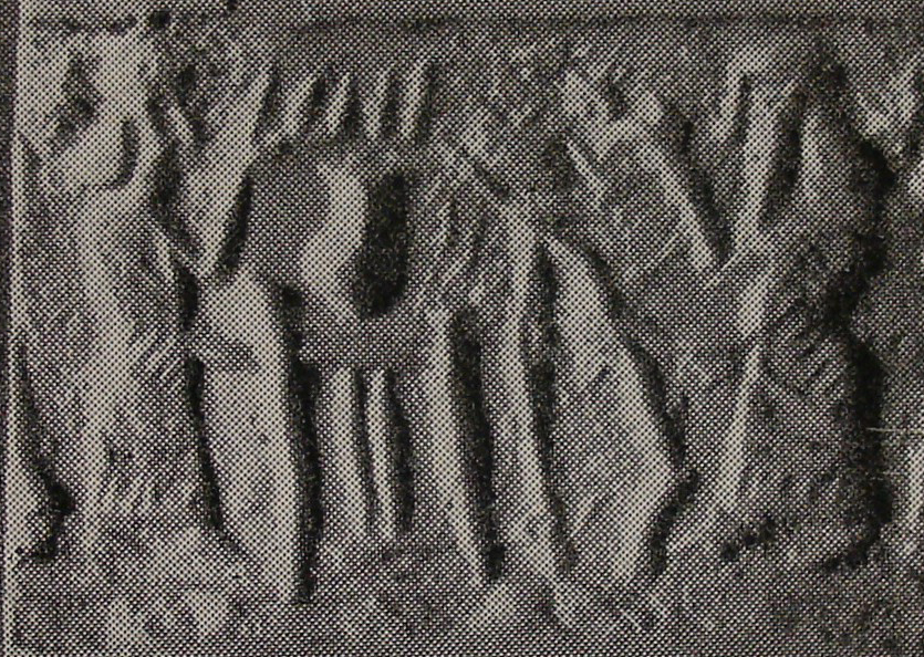 | Description of the seal image | The scene is framed by line borders at the top and bottom. A beardless attendant faces a bearded king or dignitary. The attendant wears a long fringed robe and holds a flag-shaped fan. The king wears similar clothing and holds a cup and a bow. Between the two figures is a vessel on a stand (pot-stand). |