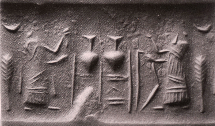 | Description of the seal image | A beardless attendant faces a bearded king or dignitary. The attendant wears a long fringed robe, has a towel thrown over his shoulder, and holds a fan. The king wears similar clothing and holds a cup and a bow. Between the two figures are two vessels on a stand (pot-stand), while behind them is an ear of wheat ('bottle-brush' tree) below a crescent moon. |
