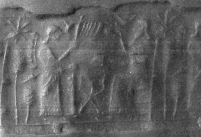 | Description of the seal image | The scene is framed by line borders at the top and bottom. A beardless attendant faces a bearded king or dignitary sitting on a throne. The attendant wears a long, broad-belted, fringed robe, has a spiked shield on his back, a sword at his waist and holds a flag-shaped fan and a cloth. The king wears similar clothing and holds a cup. Between the two figures is a table, while behind them are two ears of wheat ('bottle-brush' trees) below an eight-rayed star. A crescent moon appears above the king's hand, while a wedge is in front of the attendant's head. |