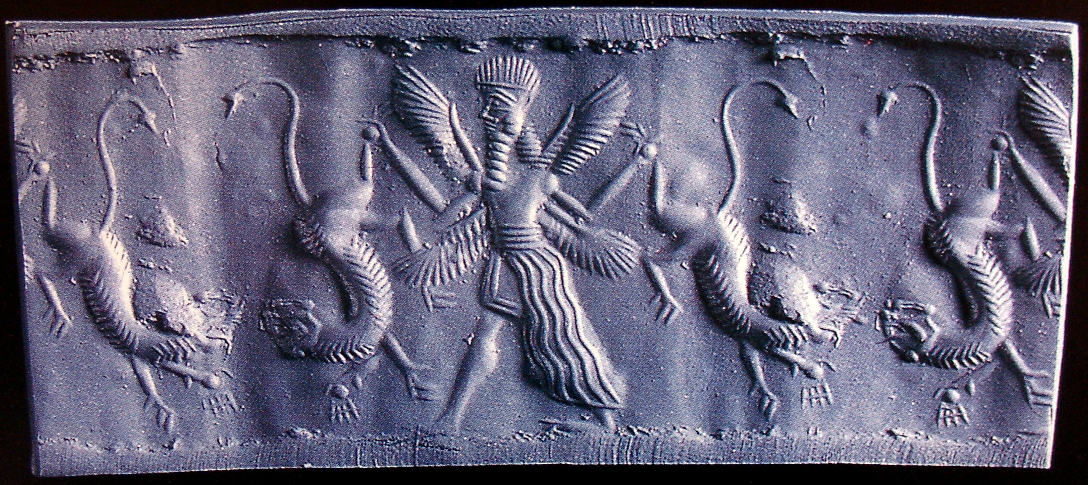 | Description of the seal image | A bearded, four-winged hero carries a lion on either side, each by a hind leg. He wears a long, quadruple-belted, open robe over a short tunic. |