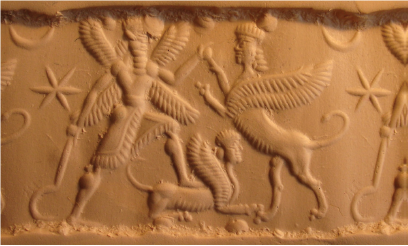 | Description of the seal image | A bearded, four-winged hero grasps a rampant human-headed winged lion (shedu, sphinx) with one hand and holds a sickle sword (scimitar) in the other while stepping on another, reclining one. He wears a broad-belted, fringed kilt. Behind him is a crescent moon above a six-rayed star. |