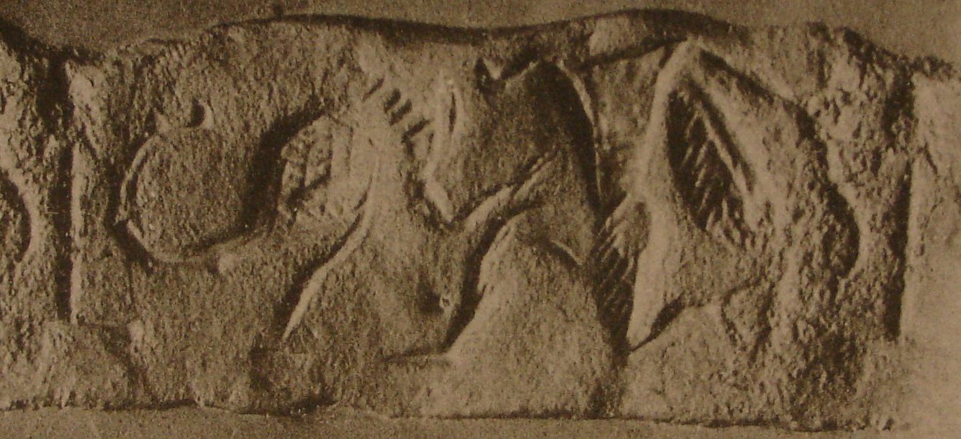| Description of the seal image | The upper third of the object has been broken off. The remaining scene depicts a half-kneeling winged hero grasping a scorpion-tailed hybrid creature with one hand and holding a sickle sword (scimitar) in the other. He wears a triple-belted, fringed tunic. Behind the two figures is the tasselled spade of Marduk on a stand. |
