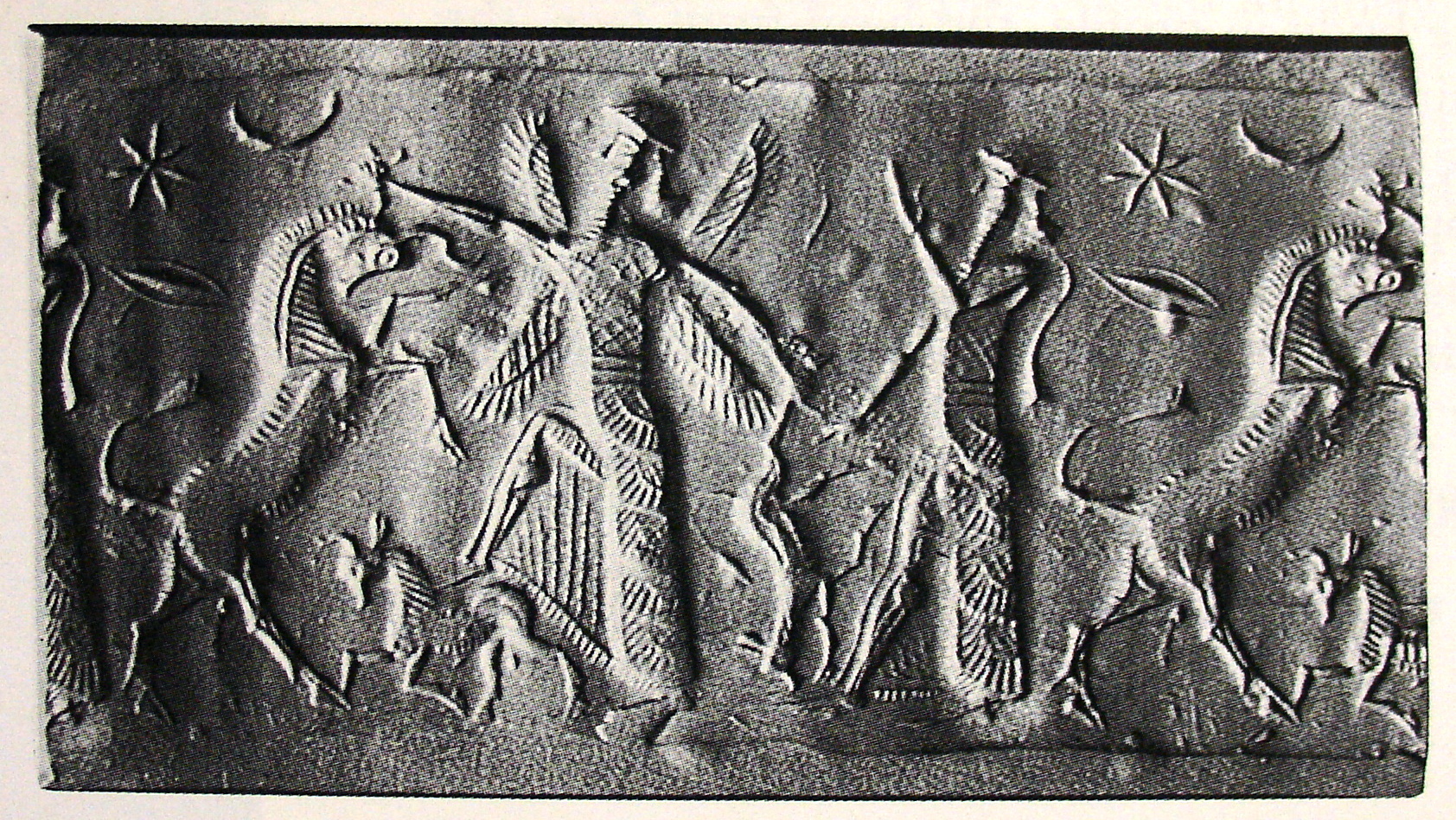 | Description of the seal image | A bearded four-winged hero grasps the ear of a rampant bull with one hand and carries the hind leg of a calf with the other, and steps on the back of another, smaller bull with his right leg. He wears a triple-belted, tiered and fringed, open robe over a short tunic. His dress is decorated with a net or crosshatch pattern above the belt. Above the largest bull are a seven-rayed star, a crescent moon, and a rhomb. Behind the winged hero is a bearded hero who wears similar clothing to that of the winged one and has a tassel hanging from his hair. |